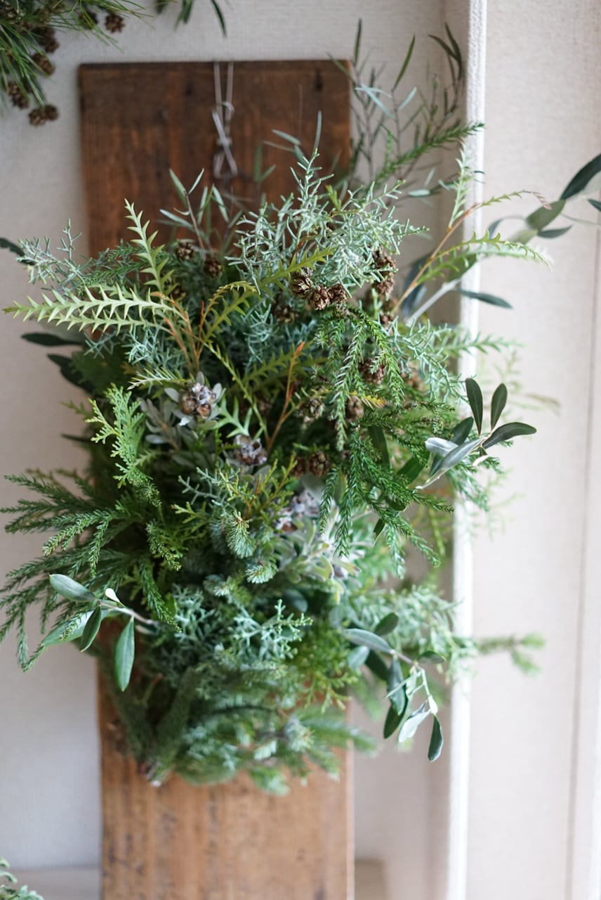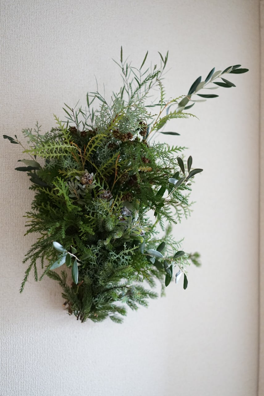 針葉樹やユーカリ、オリーブなどのグリーンでおつくりした冬らしいタペストリー